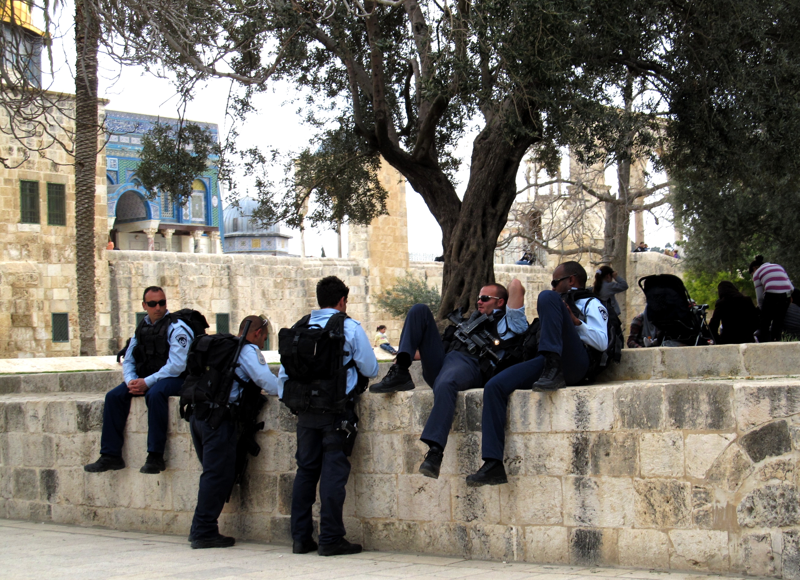 Israeli soldiers take a lunch break at the Dome of the Rock in Jerusalem, Israel