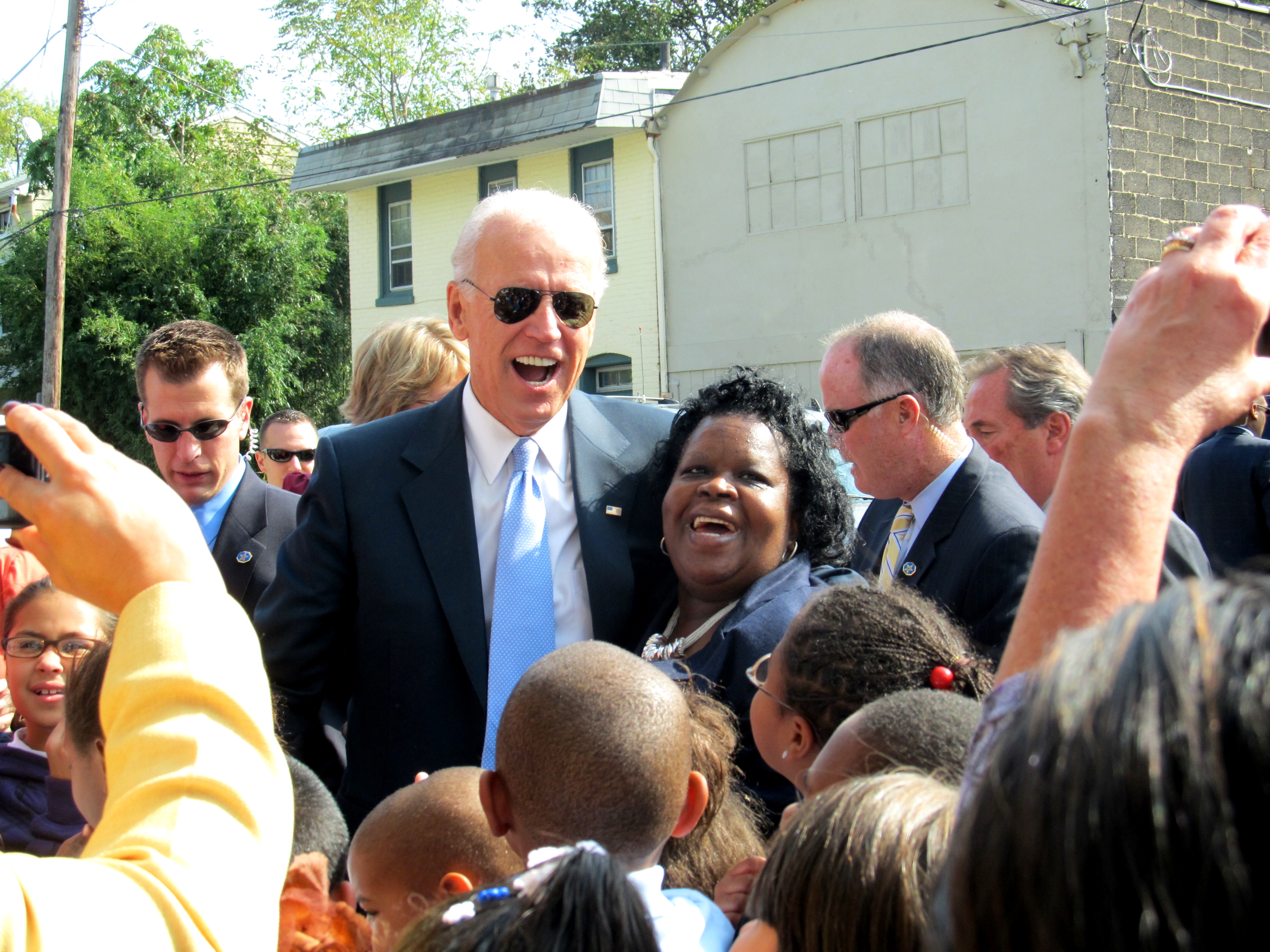 Vice President Joe Biden poses for a photograph outside Goode Elementary School in York, PA while greeting students and teachers at the playground after a speech on the Obama jobs plan
